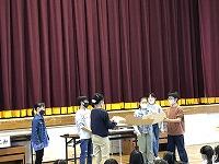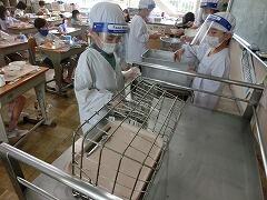 全ての児童が給食前にせっけんによる手洗いを徹底していて,給食の配食は健康状態を確認した給食当番及び教職員で行っています。毎回「給食当番衛生チェック」表に基づき,体調,爪,手洗い,白衣・マスクを確認して準備を始めます。配食しやすいように皿数を減らしたり,袋詰めのものにするなど工夫しています。給食当番は配るものによってビニール手袋を使用していますが,食器を扱う手は滑って割ったりやけどをしたりする危険もあるため使用していません。手洗いを十分することで対応しています。また,会食は間を取って全員前を向いて食べています。