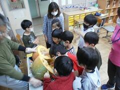 切ったかぼちゃの中をみんなでくり抜いて、この後は、『ジャック オー ランタン』を作る予定です。ハロウィンに向けて、手作り衣装も作り始めています。