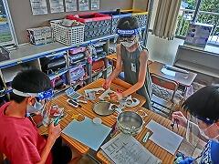 全ての児童が給食前にせっけんによる手洗いを徹底していて,給食の配食は健康状態を確認した給食当番及び教職員で行っています。毎回「給食当番衛生チェック」表に基づき,体調,爪,手洗い,白衣・マスクを確認して準備を始めます。配食しやすいように皿数を減らしたり,袋詰めのものにするなど工夫しています。給食当番は配るものによってビニール手袋を使用していますが,食器を扱う手は滑って割ったりやけどをしたりする危険もあるため使用していません。手洗いを十分することで対応しています。また,会食は間を取って全員前を向いて食べています。