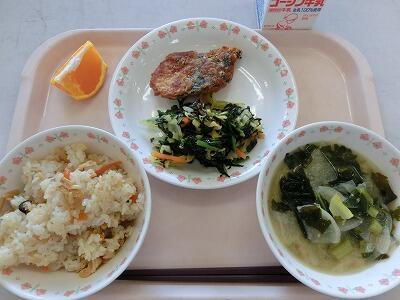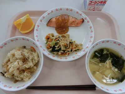 牛乳 きのこのたきこみごはん 鮭のゆず味噌かけ 切干大根の煮物