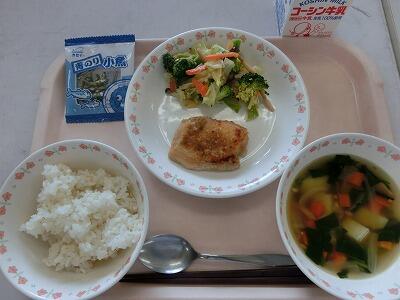 牛乳 ジューシーとり肉の味噌焼き きのことブロッコリーのサラダ ほくほくのポテトスープ 青のり小魚 <今日の給食> 【2月24日(水)6-1考案】