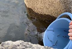 その後,大きな利根川へ到着し,バケツにサケを移し,ついに旅立ちの瞬間です。