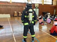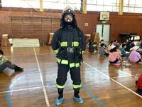防火衣に着替えるところや空気ボンベを見せていただいたり,消防車の装備を教えていただいたりしました。