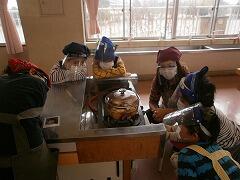 「猫の手」で切って,お鍋の中へ。泡がブクブク.。o○お芋のダンスをみんなでのぞきました。ほんの少しづつですが,美味しくいただきました。