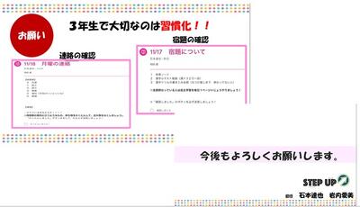 クロームブックに送信している『明日の予定や持ち物等の連絡』や『宿題』を必ず一緒に見て確認してください。「宿題やった?明日の用意した?」「宿題やりなよ~!用意しなよ~!」「うん!やった!」「うん!やる!」だけのやり取りだけでは,中々身に付きません。3年生は習慣化を図る大切な時期です。基本的なことが当たり前にできる子どもの成長を目指して,子どもも,保護者も,学校も一丸となって頑張っていきましょう!