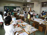 クラスごとに作品展を訪れ,子どもたちは興味津々で見入っていました。