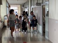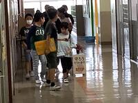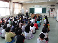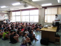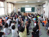 地震が起こった後、火災が発生したことを想定しての避難だったので、口にハンカチをあてて校庭へすばやく避難しました。低学年は1学期よりもすばやく避難できました。すばらしいですね!