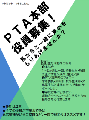 【PTA】「役員募集ポスター」「PTA本部ってなあに?」を掲載しました。