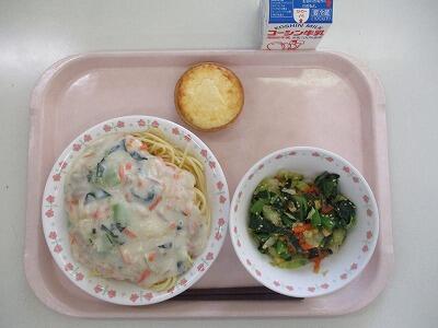 ・牛乳・スパゲティホワイトソースかけ・ゆで野菜のごまサラダ・手作りタルトチーズケーキ