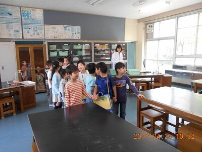 2年生が理科室を案内しました。1年生は2年生の説明を聞いていました。