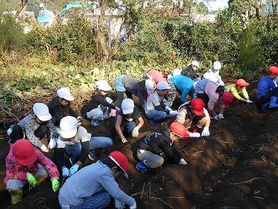 <真剣な表情でサツマイモ掘りをする子供達>