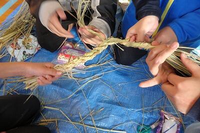 下田の杜里山協議会の皆さまに教わりながら,脱穀後の藁を使い,しめ縄作りを行いました。グループで協力し,ねじった藁をみんな上手に編みました。