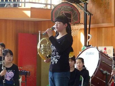 本日昼休みに,体育館でスプリングコンサートがありました。吹奏楽部が1年間のまとめとして,全校の前で演奏してくれました。6年生,一人ひとりからのメッセージや演奏,クイズなどもありとても楽しいコンサートとなりました。演奏もすばらしかったです。