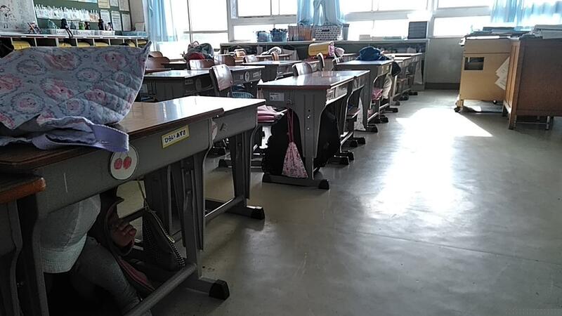 ①清水教頭先生の緊急放送 ②机の下にもぐります(地震) ③担任を先頭に校庭に出ます