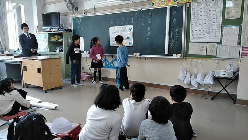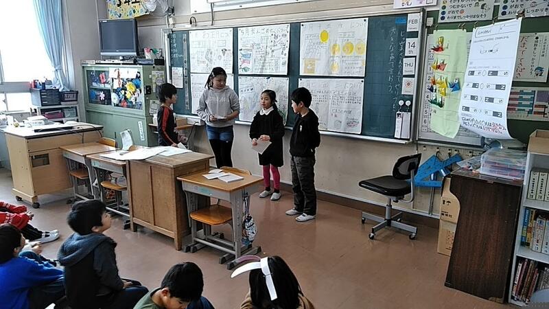 ↑物語の続きの予想を発表する子どもたち↑大石先生による物語の続きの本の紹介