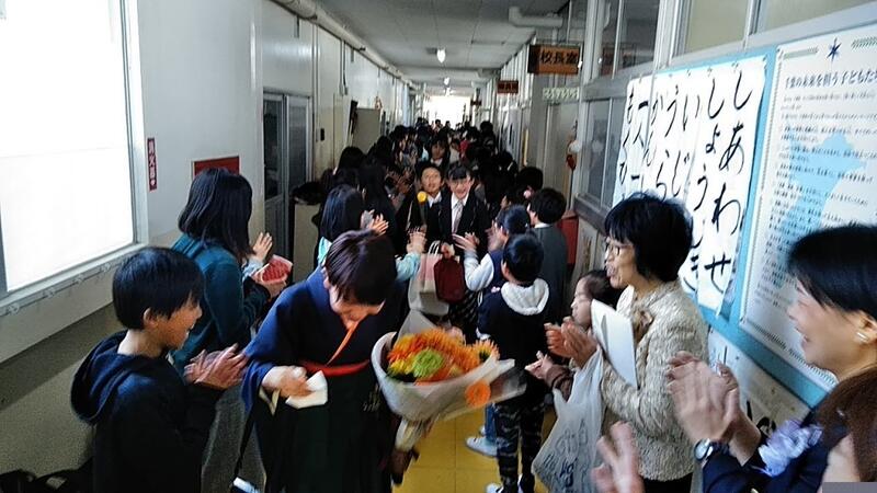 ↑6年1組を見送る在校生 ↑6年2組を見送る在校生