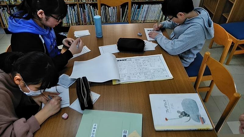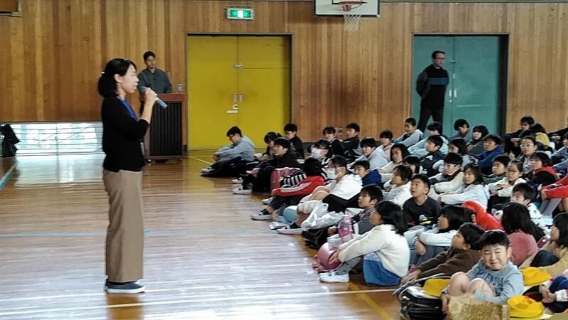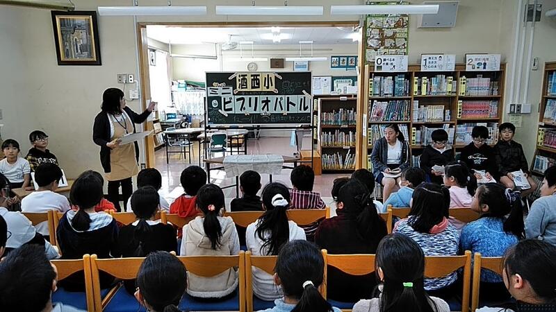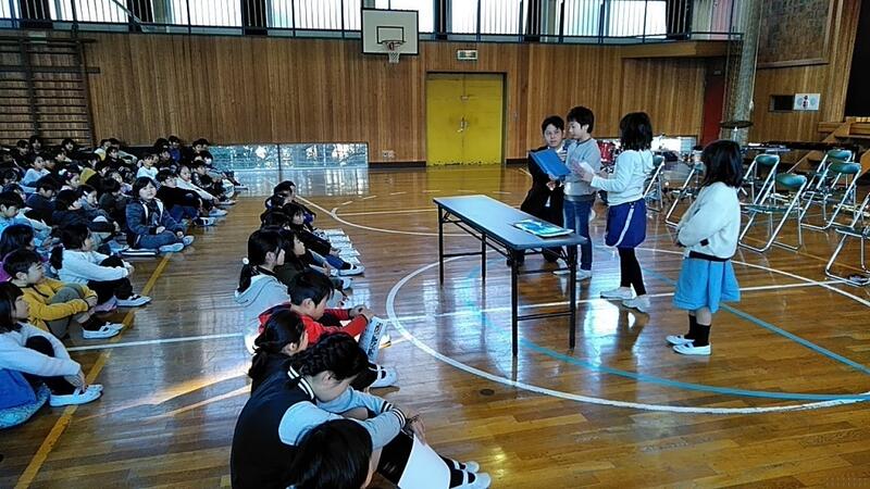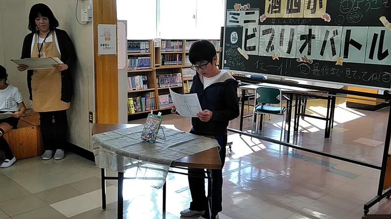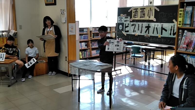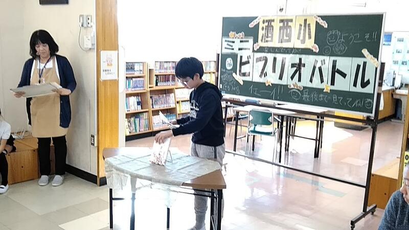 本校初となる「ミニビブリオバトル」(本を紹介する発表会)が図書室で行われました。発表は図書委員会の山城さん髙橋さん上村さん佐藤さんの4人でした。4年生全員と5,6年生が聞き役で、どの本の紹介がよかったかを投票で決めました。第1回優勝者は上村さんが紹介した「5分後に意外な結末」になりました。どの発表も本の内容をわかりやすく表現できました。指導してくださった図書館指導員の大石先生ありがとうございました。