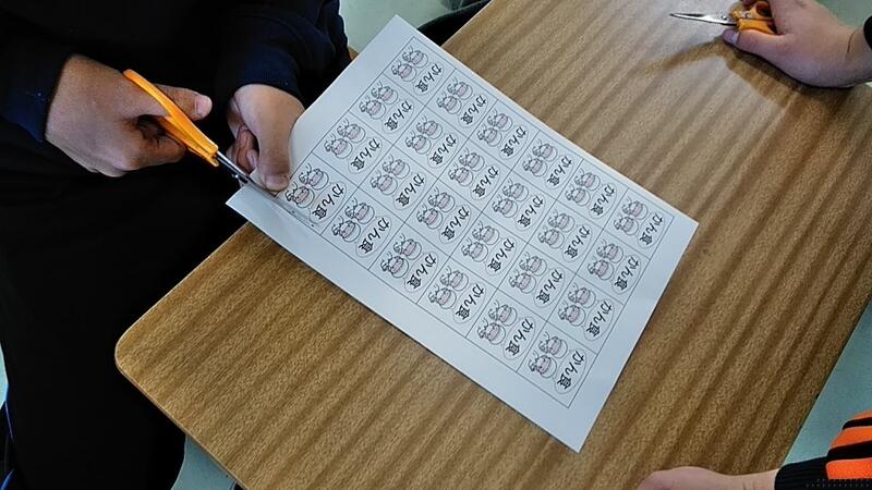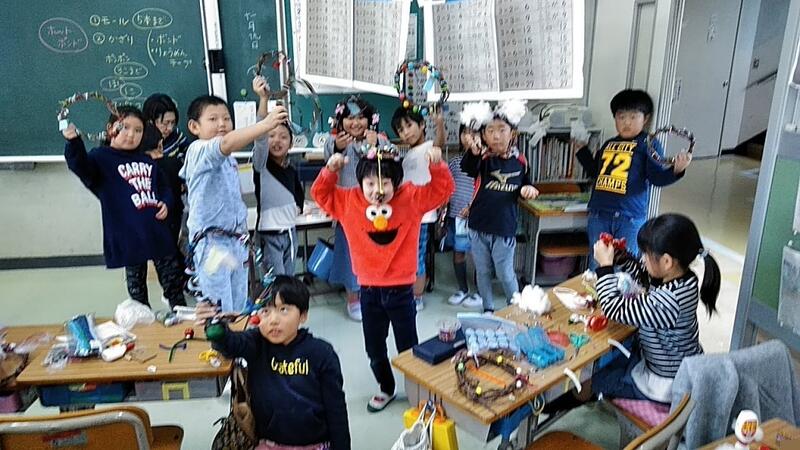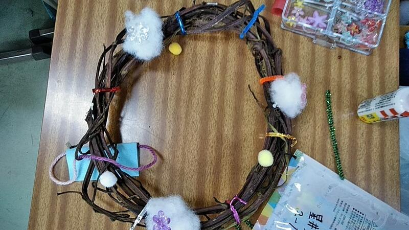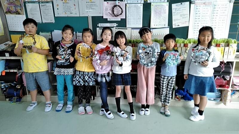 2年生の図画工作では、「リース作り」に取り組んでいました。リースは、近くの横尾さんの畑でとれたさつまいものつるを使っています。