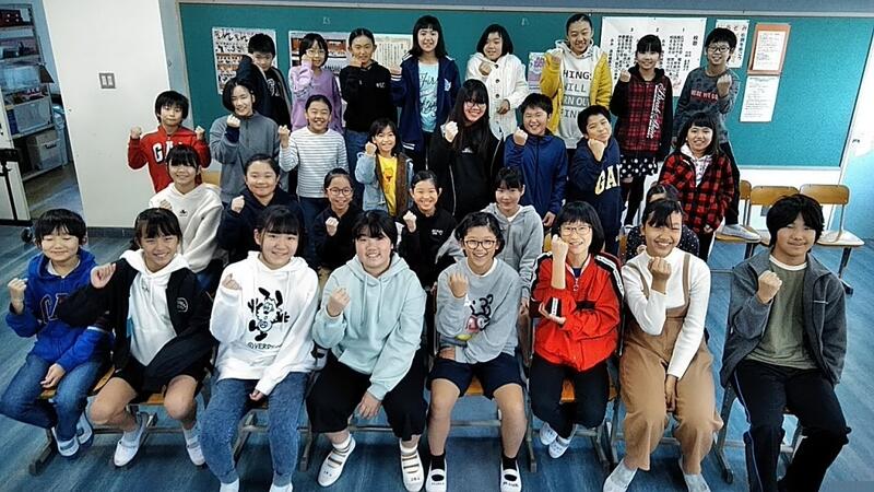 ↑染谷先生(中央)とALTアニシアさん(左)     ↑教科書
