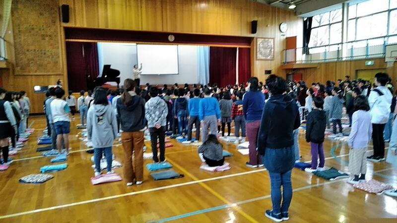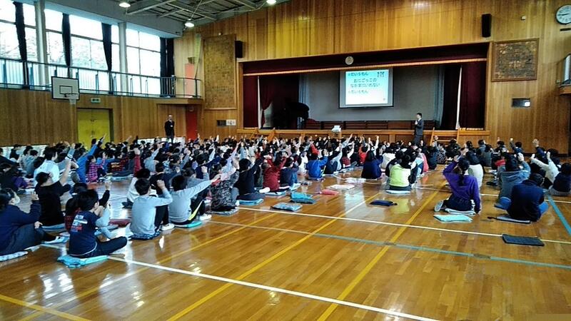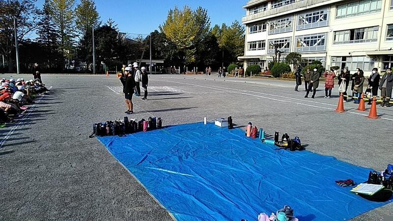 ↑今日は校庭がぬかるんでいるため、校舎前に集合しました。