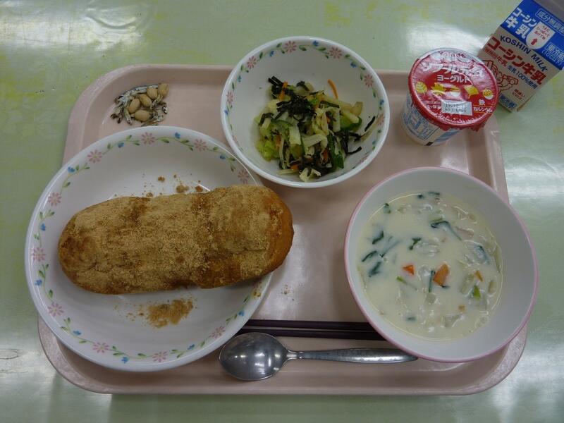 ↑揚げパン、和風サラダ、かぶのポタージュ、ヨーグルト、小魚、牛乳
