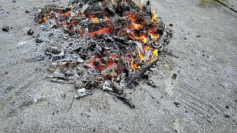 ①まずは木材を燃やして「おき」(炭)つくり   ②「おき」に新聞紙ホイルで包んだいもを入れます