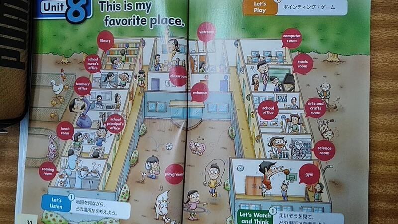 4年生の外国語活動は、毎週1回(年間35時間ほど)担任とALTのアニシアさんの2人で行っています。今日は自分の好きな学校での場所についての活動をしていました。
