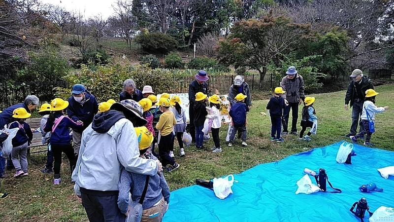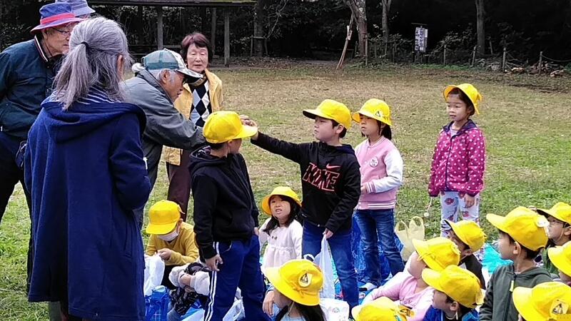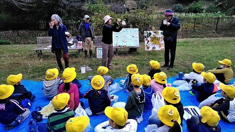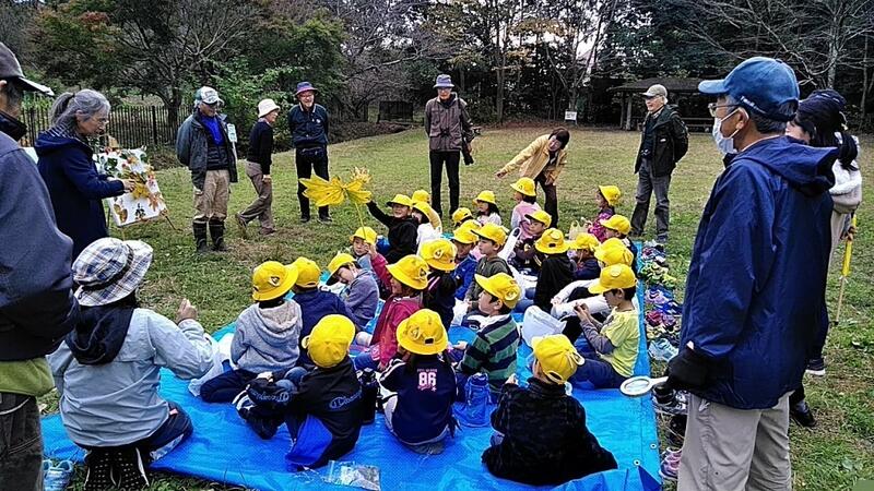 1年生が下田の杜で「秋をさがそう」をしました。いつもの通り下田の杜を守る会の人たちがいろいろと教えてくれました。子どもたちは楽しそうに秋をさがしていました。