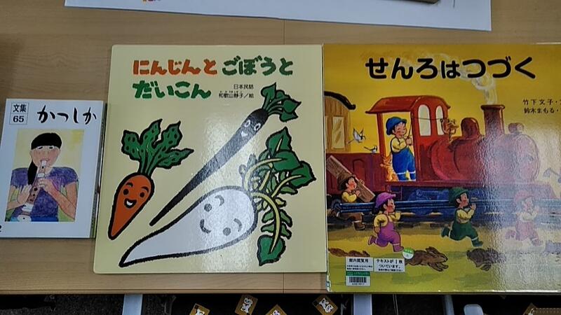 ↑はじめは「にんじんとごぼうとだいこん」 ↑2冊目は「せんろはつづく」