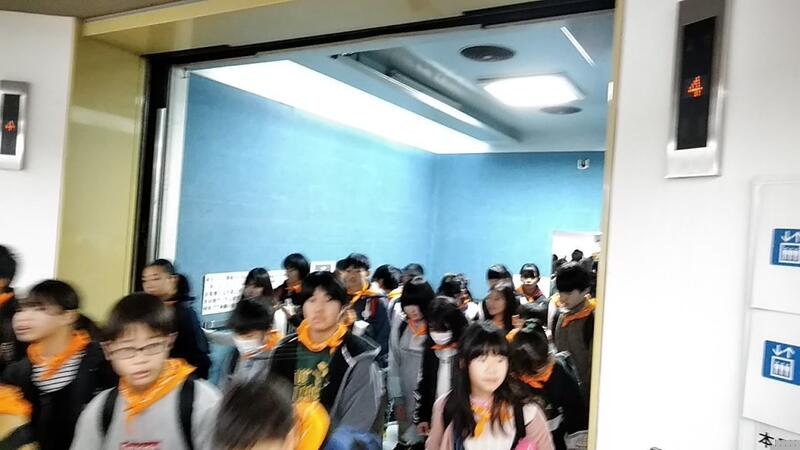 ↑日本一大きなエレベーター(定員124名)に乗って昼食場所に ↑体験の様子