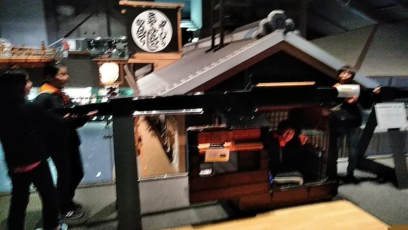 ↑江戸東京博物館入口で(左上は両国国技館) ↑駕籠に乗り、気分はもうお殿様