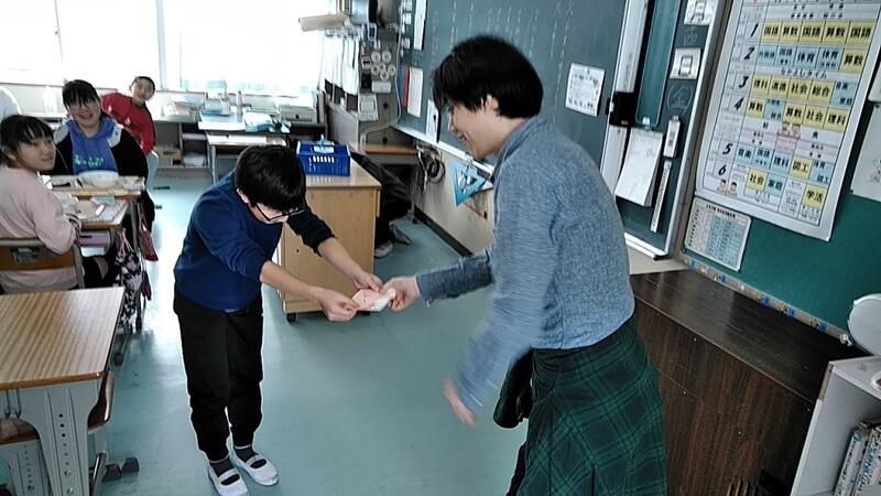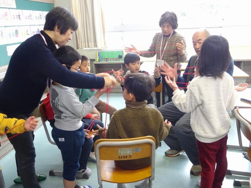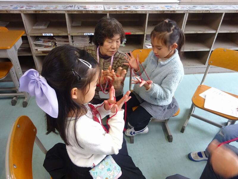 この前、酒井根保育園の園児との交流会をしましたが、今回は地域の大先輩達をお招きし、昔の遊びをしたあと、本校自慢の給食を食べていただきました。