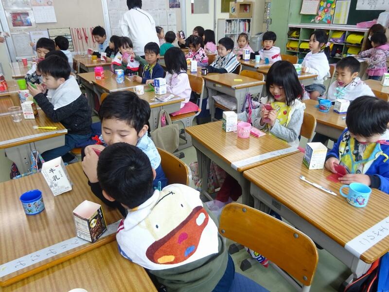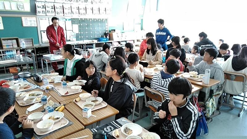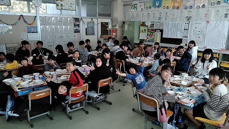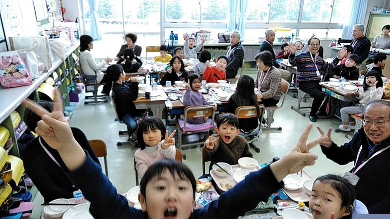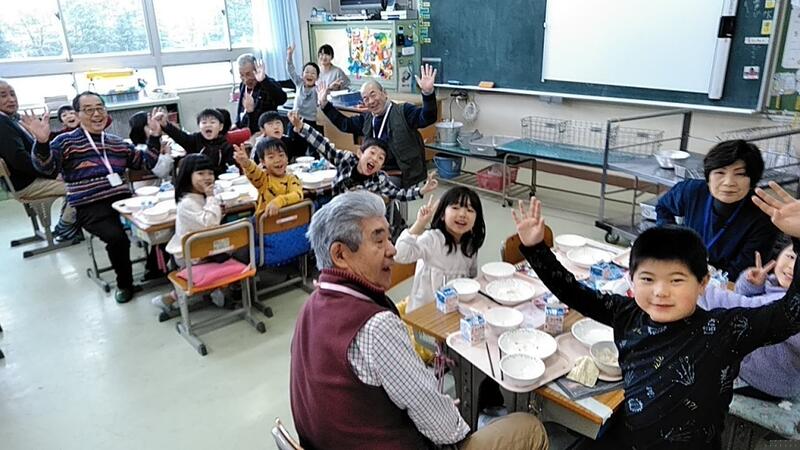 ↑おじいちゃんおばあちゃんと一緒に給食中!