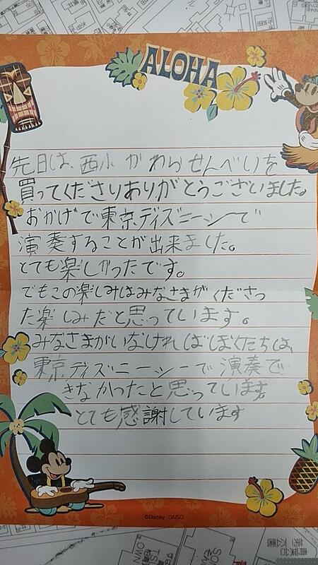 昨年12月30日のデイズニーシーでの演奏のために、「西小瓦せんべい」購入にご協力いただきありがとうございました。先週より、買っていただいた方に、感謝の手紙をお渡ししています。(吹奏楽部全員が1人3通~5通書きました。)今月中には全員にお配りできると思います。ありがとうございました。