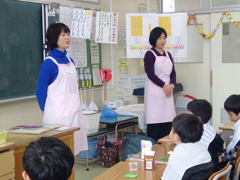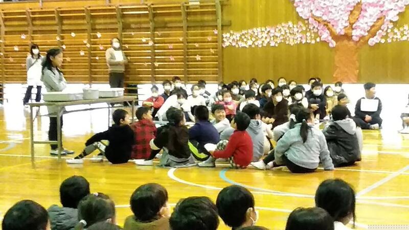 ↑最後の給食「ひな祭り給食」を説明する十亀栄養士・しあわせにんじん&しあわせ花びら