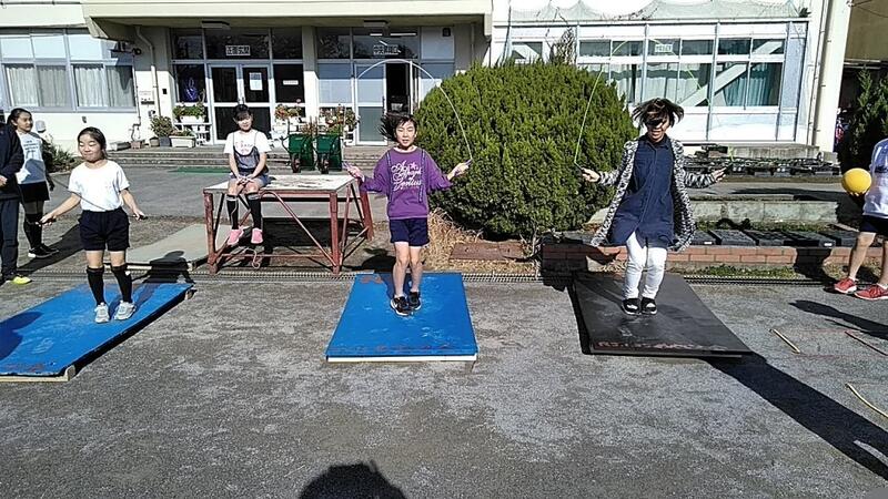 ↑なわとびが得意の平久先生(右端)は子どもたちと二重跳び勝負(50回以上とべていました)