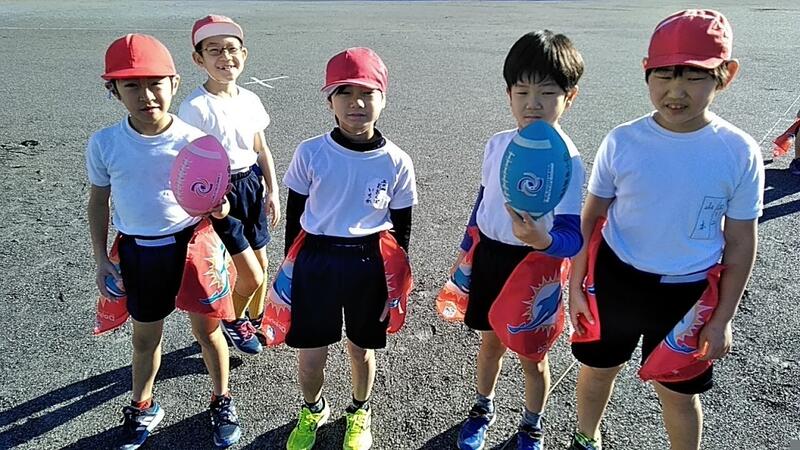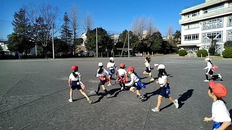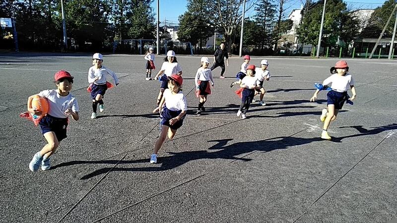 冬の体育は、なわとびやサッカーが主流でしたが、最近このタグラグビーに取り組む学校も増えてきました。基本的にはラグビーのルールと同じなのですが、タックルのかわりに、両腰につけた「タグ」をとられたらパスをしなければならないこととキックなしということです。運動量が多いこととチーム全員が協力し「ワンチーム」にならないと勝てないという特長があります。3,4年生がやっています。