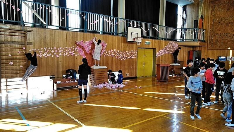 明日(12日)は中学校の卒業式です。今日、酒井根西小では、先生方で体育館や6年生の教室の飾り付けとワックスがけをしました。