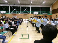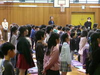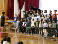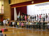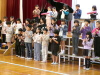ステージ上の6年生の指揮に合わせて元気いっぱいに歌っていました。