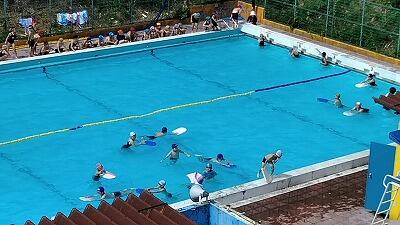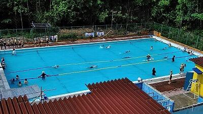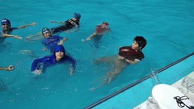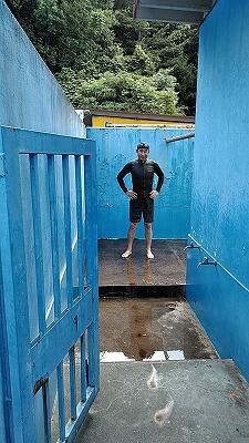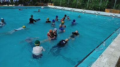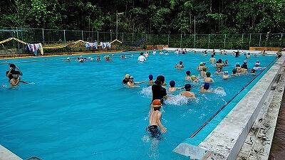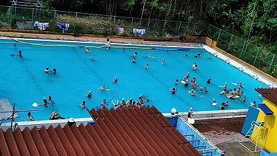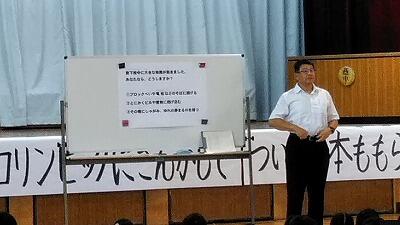 ↑安全確認のためPTA会長の石橋さんが全校児童の前で泳いでくれました(ありがとうございました)
