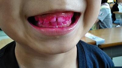 ↑カラーテスターでみがき残しチェック↑菅野さんのいうとおりにみがくと ↑このとおりきれいになりました
