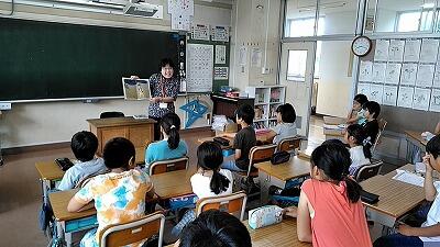 先週、今週と天気があまりよくないこともあって、なかよしタイムや昼休みの図書室には大勢の子どもたちがきています。今年度から1回に3冊借りられることになり、貸出数も約1.5倍(昨年比)に増えています。図書室には、図書館指導員の大石先生が常駐し、貸し出しの他、調べ学習でのアドバススなど本に関する相談もしてくれています。