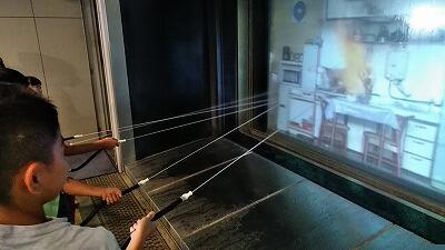 ↑消火器体験 ↑暴風雨体験 ↑地震体験