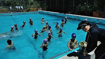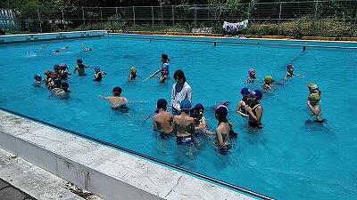ペンキを塗り,きれいになった「プール」で「全校プール開き」を行いました。