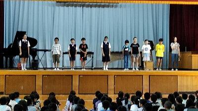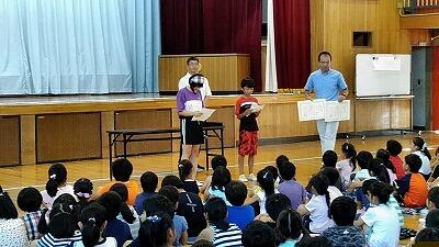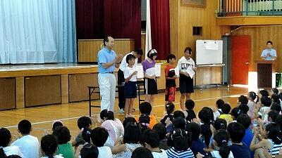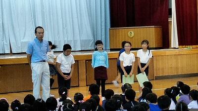 昼食時に放送委員会が行っている「クラス対抗クイズ大会」で5-1が見事優勝しましたので、放送委員会からの表彰されました。全クラス、どんな問題が出るのかいつも楽しみにしているようです。ちなみに学校には「逆上がり補助台」は何台あるでしょうか?(正解3台)のように、酒西小にかかわる出題でした。
