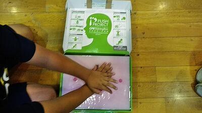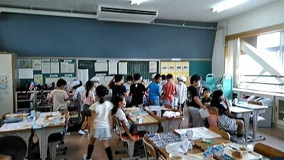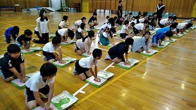 ↑6年生は「簡易トイレ」の作り方↑5年生は三角巾の使い方紙スリッパの作り方
