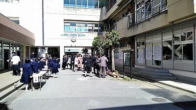 ↑体育館前 ↑昇降口前でのクラス発表