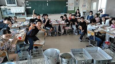 ↑五目ちらし寿司鯖の照り焼き若竹汁他 ↑噂通り5年生の食缶は空でした(左5-1右5-2)