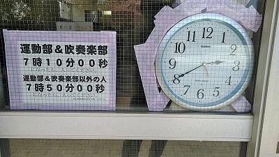 ↑各昇降口には「7時10分00秒になるまで学校内には入れません」との表示と電波時計