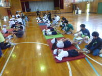 1,2年生は教室に戻るときに跳び箱を建物,ボールを自動車に見立て,安全に横断歩道を渡る練習をしました。今日のお話を思い出し,全員が上手にわたることができました。手の上げ方も立派でした。